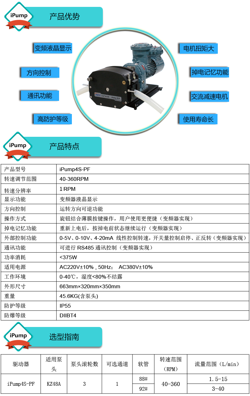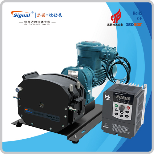 1.流量范圍:1.5-40L/min 2.彈性壓管結構,軟管壽命長,非常適合大流量液體傳輸 3.免維護交流減速電機驅動,變頻器調節(jié)轉速 4.全金屬泵頭,高精度,更可靠 5.防爆等級DIIBT4,適合易燃易爆環(huán)境使用