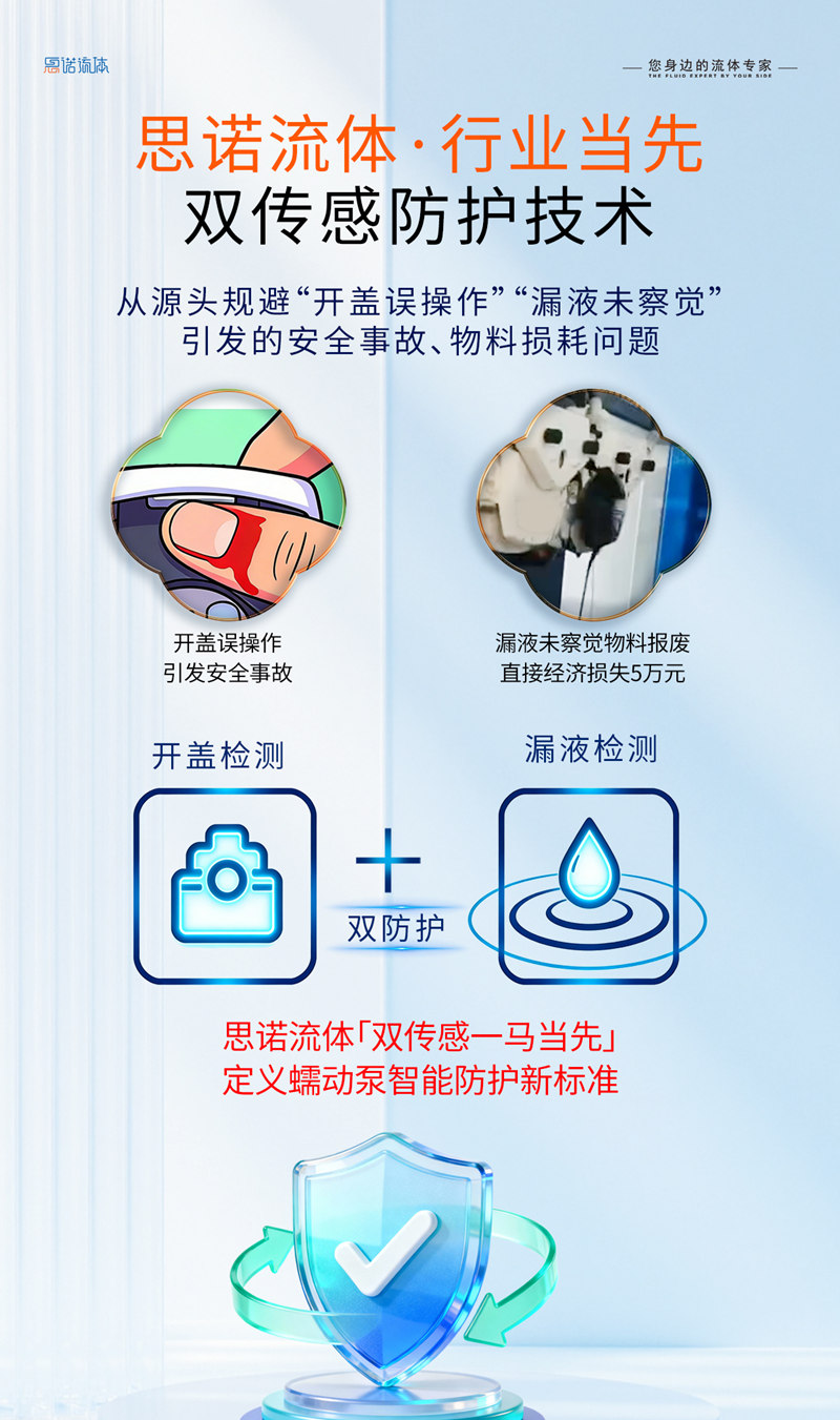保定思諾流體科技有限公司是行業(yè)內(nèi)較早推動(dòng)安全防護(hù)系統(tǒng)性升級(jí)的企業(yè)。在傳統(tǒng)蠕動(dòng)泵僅依靠機(jī)械結(jié)構(gòu)進(jìn)行被動(dòng)防護(hù)的時(shí)期,思諾流體的研發(fā)團(tuán)隊(duì)就開始思考:如何讓設(shè)備具備主動(dòng)識(shí)別風(fēng)險(xiǎn)、提前干預(yù)的能力?正是基于這一前瞻性思考,公司率先將“開蓋檢測(cè)”與“漏液檢測(cè)”雙傳感器技術(shù)系統(tǒng)化應(yīng)用于蠕動(dòng)泵產(chǎn)品,開啟了行業(yè)智能主動(dòng)防護(hù)的新階段。
