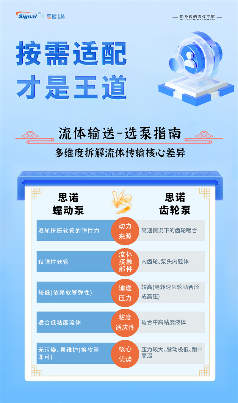按需適配,方為選型王道。蠕動(dòng)泵和齒輪泵各有千秋。蠕動(dòng)泵輸送溫和、無污染、易清潔且能處理含固體顆粒流體,尤其適合衛(wèi)生、腐蝕性或剪切敏感介質(zhì)。齒輪泵則結(jié)構(gòu)緊湊、輸出壓力高、流量穩(wěn)定且效率高,適合高粘度流體和高壓需求。兩者并無絕對優(yōu)劣,關(guān)鍵在于根據(jù)具體應(yīng)用需求(如介質(zhì)特性、壓力、流量、衛(wèi)生等級、預(yù)算)進(jìn)行精準(zhǔn)適配。