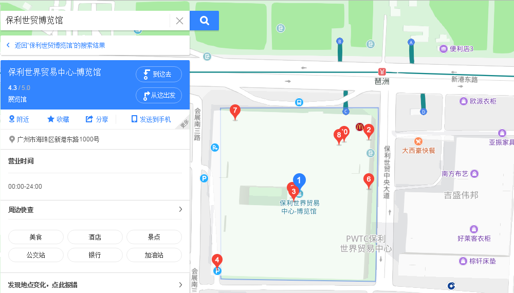 琶洲站地鐵口接駁機(jī)場(chǎng)及其它地鐵線路,便捷到達(dá)廣州市區(qū),出地鐵口步行可直達(dá)展廳門口。